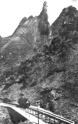 Trem descendo a Serra dos Órgãos, com a vista do Dedo de Deus ao fundo. De 1895 a 1957 o trem foi o meio de transporte que ligava Teresópolis ao Porto Piedade, passando por Guapimirim Apesar do mito de que um acidente tenha sido o motivo da desativação do ramal Guapimirim x Teresópolis. foram as políticas de erradicação de ramais deficitários e a construção da BR 116
