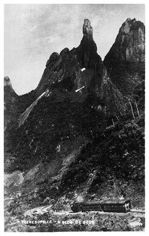 Trem descendo a Serra dos Órgãos, com a vista do Dedo de Deus ao fundo. De 1895 a 1957 o trem foi o meio de transporte que ligava Teresópolis ao Porto Piedade, passando por Guapimirim Apesar do mito de que um acidente tenha sido o motivo da desativação do ramal Guapimirim x Teresópolis. foram as políticas de erradicação de ramais deficitários e a construção da BR 116